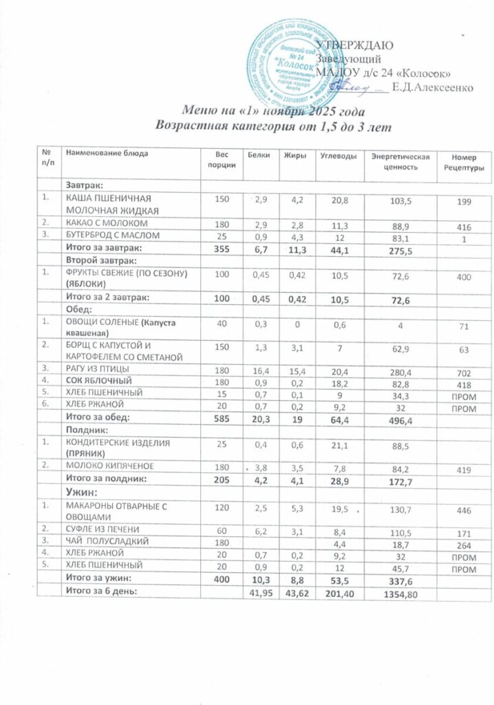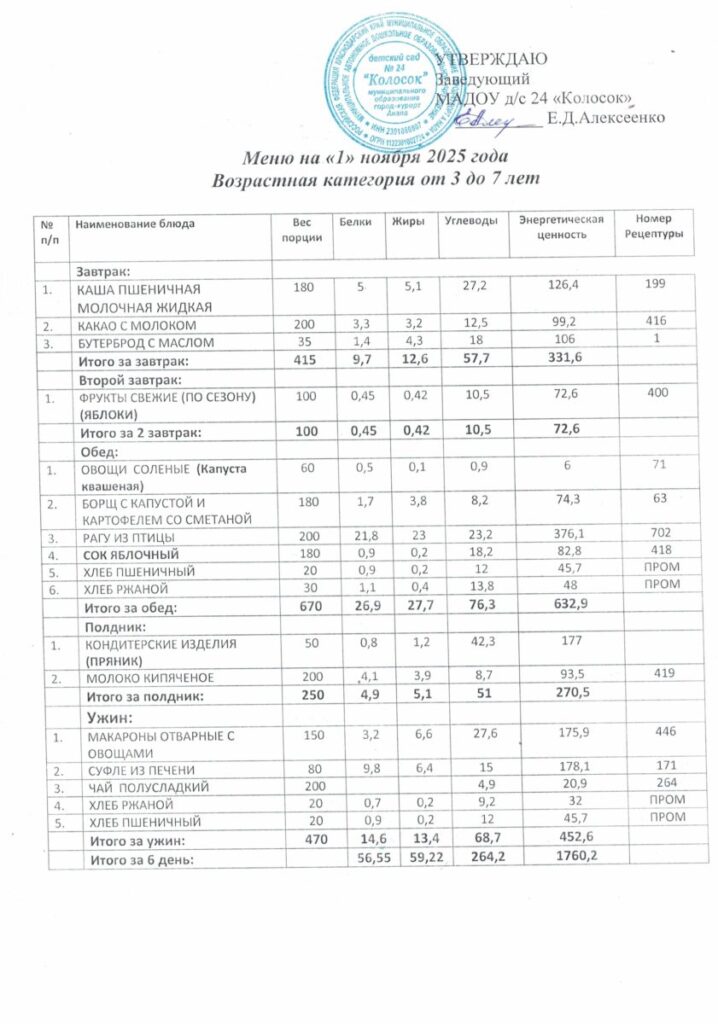 Приказ об утверждении 10-ти дневного меню.